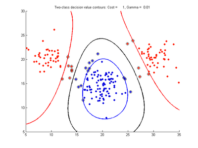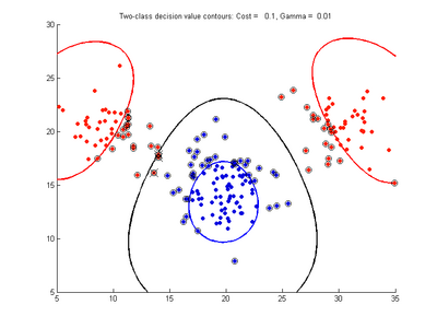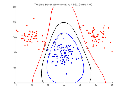 Fig. 4a-d show the effect of decreasing the nu parameter from 0.5 to 0.01 while gamma is kept fixed = 0.01. These figures show that decreasing nu has the same effect as was obtained by increasing the cost parameter, that is, it causes the margin width to decrease. It shows how nu is simply a different representation of the cost penalty parameter, and for any value of nu there is a corresponding value of cost which produces the same SVM. The reason for its use is that its value can be interpreted as a lower bound on the number of samples which are support vectors, and also as an upper bound on the number of misclassification errors.