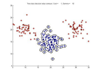 Svmda is implemented using the LIBSVM package which provides both cost-support vector regression (C-SVC) and nu-support vector regression (nu-SVC). Linear and Gaussian Radial Basis Function kernel types are supported by this function.