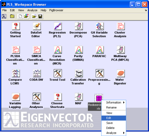 Data can be readily loaded with the use of the Workspace browser. The browser can be launched by typing "browse" at the Matlab command line. If you are using Solo, the browser appears after the application is launched. In this example we'll import an Excel file included with PLS_Toolbox and Solo. Using the File menu, select Import Data..., and then select Excel File (XLS.... |