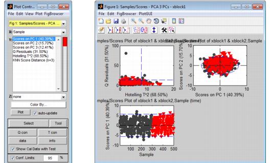 - The figure below shows some of the possible Scores plots for when applying the PCA model that you built during the Calibration phase to validation data. Note that initially, the plots show both the calibration data (