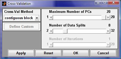 When the Cross-Validation window in Analysis GUI is first opened, the parameters specified in the slider bars default to values that are based on the dimensionality of the data. In this case, the loaded X and Y variables, spec1 and conc from nir_data.mat, have 30 objects, and the default number of Data Splits is the integer closest to the square root of the number of objects, which is equal to 5.