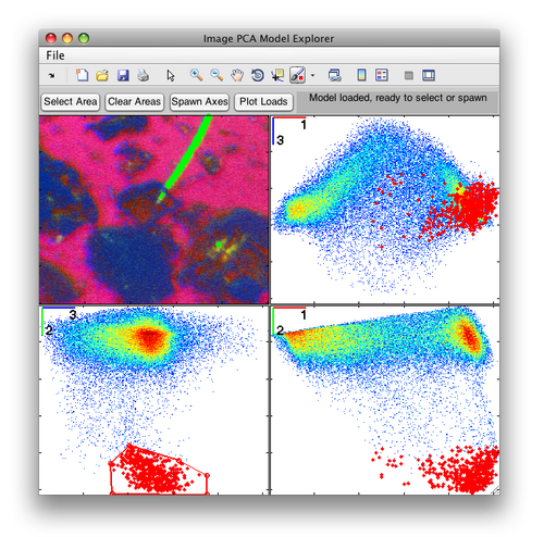 The ImageGUI is a PCA model exploring interface. It allows you to select areas in the image and or in scatter plots of the first 3 PCs. In the image to the right we are able to see where a feature within the image lies in the scores space. If you need to explore more than the first 3 PCs the ImageGUI functionality can be recreated using subplots within PlotGUI. |