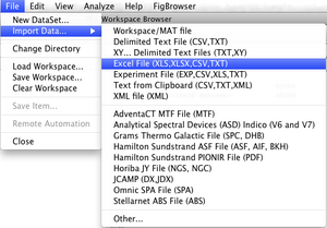 In this example we'll import an Excel file included with PLS_Toolbox and Solo. Using the File menu, select Import Data..., and then selectExcel File (XLS....